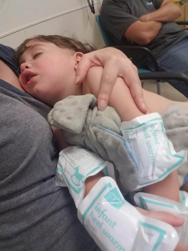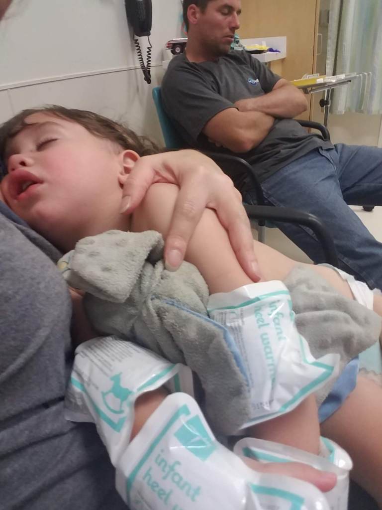 After the PA watched him walk she called the neurologist who decided based off the PA’s evaluation that Isaiah needed further testing done to rule out anything on the brain or spine. With that being decided the nurses brought us some hot packs to place on his arms to prepare for an iv.
